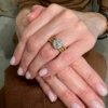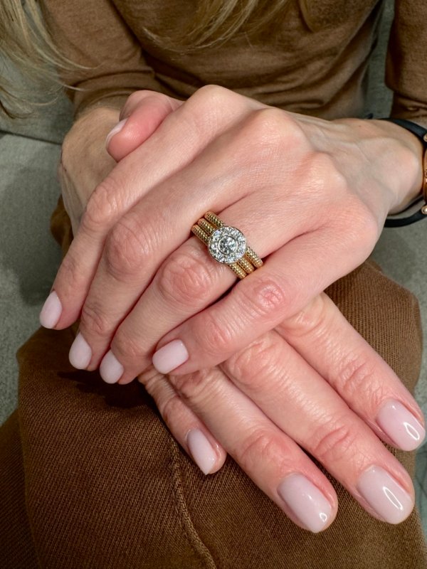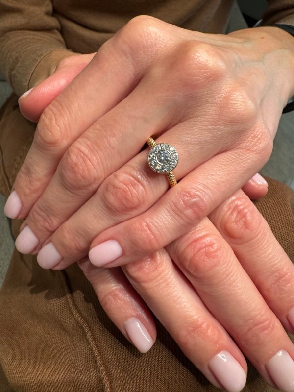 Central diamond: RW+ VS. Carat’s total weight is approximately 0.28 ct.