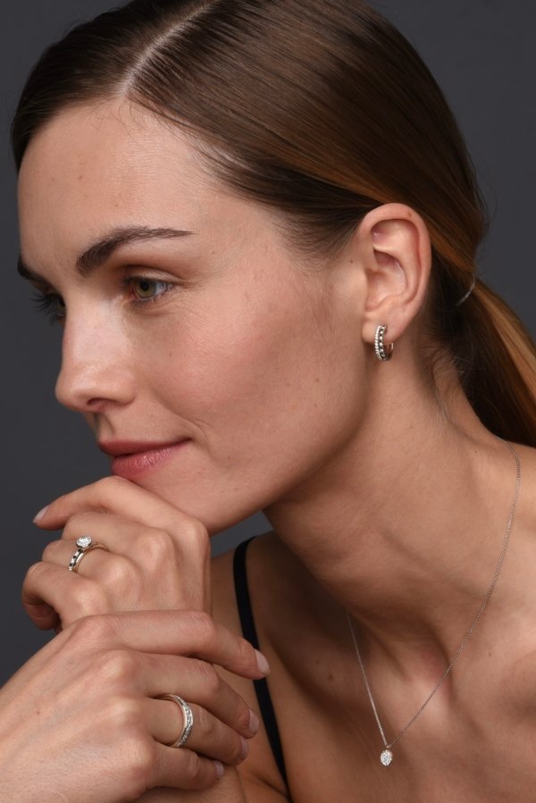 750 prabos geltonas arba baltas auksas. Balti deimantai: idealaus šlifavimo, RW+, VS ~0.15 ct. Juodi deimantai: ~0.09 ct.